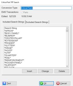 To view, add or change the Critical Part TRT Search Strings go to “Setup”, “RO Status Processing”, “Critical Parts TRT Search”.