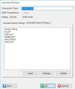 On the “Excluded Search Strings” Tab, you must add any conversion type “global” conditional exclusions to the included search strings.  For example, if you want to convert “bumper” but wanted to exclude any line that reads “bumper clips”, then add the string “clip” to the “Excluded Search Strings” list.  Remember that this list is global to the Critical Part Included Search Strings.