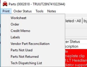 Worksheet –Prints the parts worksheet for that RO. (All parts on the job)