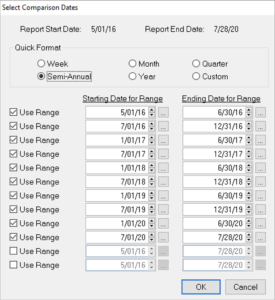 Comparison reports require a quick format choice and date range selections. Once the OK button is clicked, a second page with appear. Choose format type and specific date ranges on this screen. (The date range from the first page will be broken down on this page. The user can choose to include all the dates or selected date ranges).